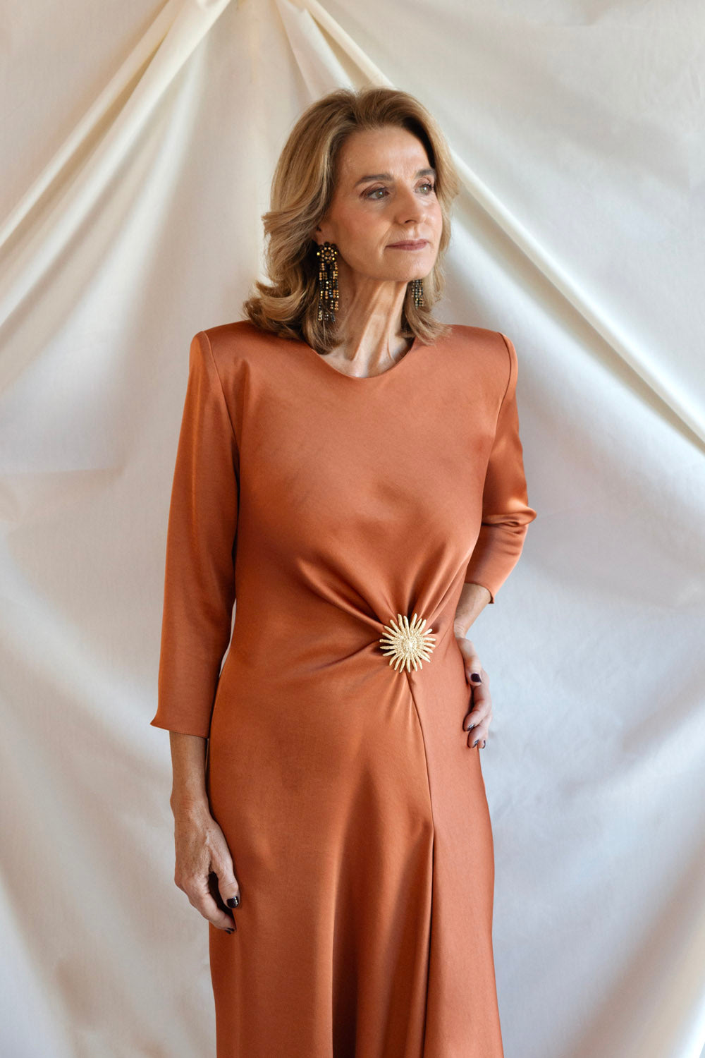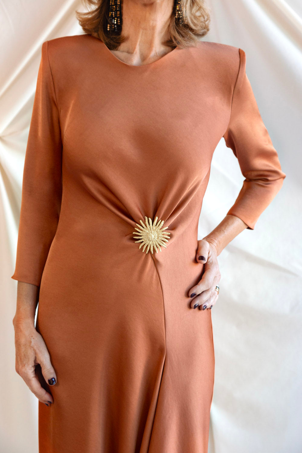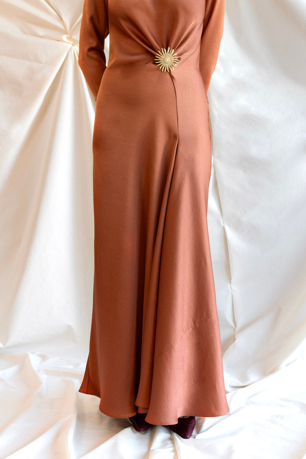 Gracias a su confección al bies y su tejido crepe de alta calidad, ofrece una caída fluida y elegante que estiliza la figura. Además, puede complementarse con nuestros broches (no incluidos) para personalizar el look y hacerlo aún más especial.